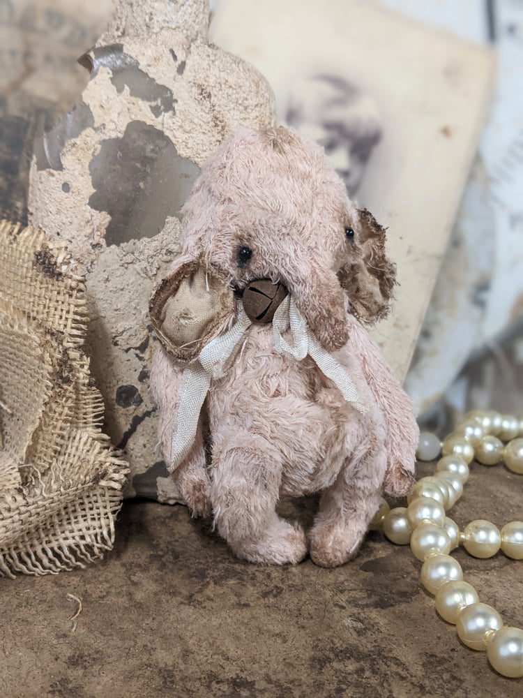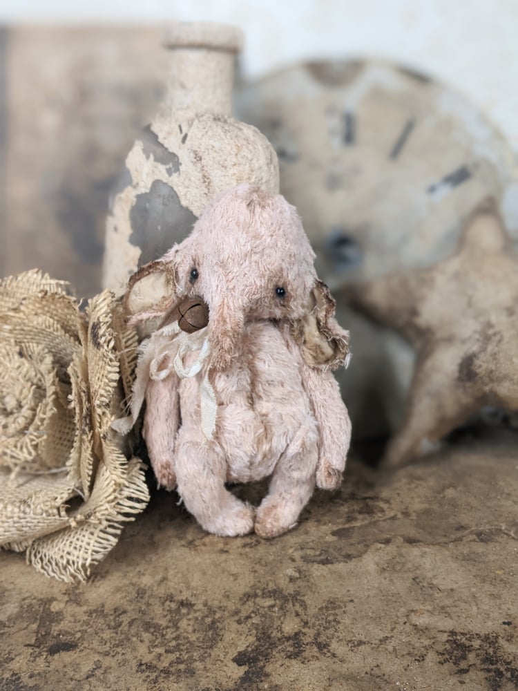 He is made of hand dyed very lightly distressed pink fur. Has long aged trunk with sad droopy ears.... distressed. Has glass eyes then shaded for depth. Has aged paw pads with "holes" for additional age... .